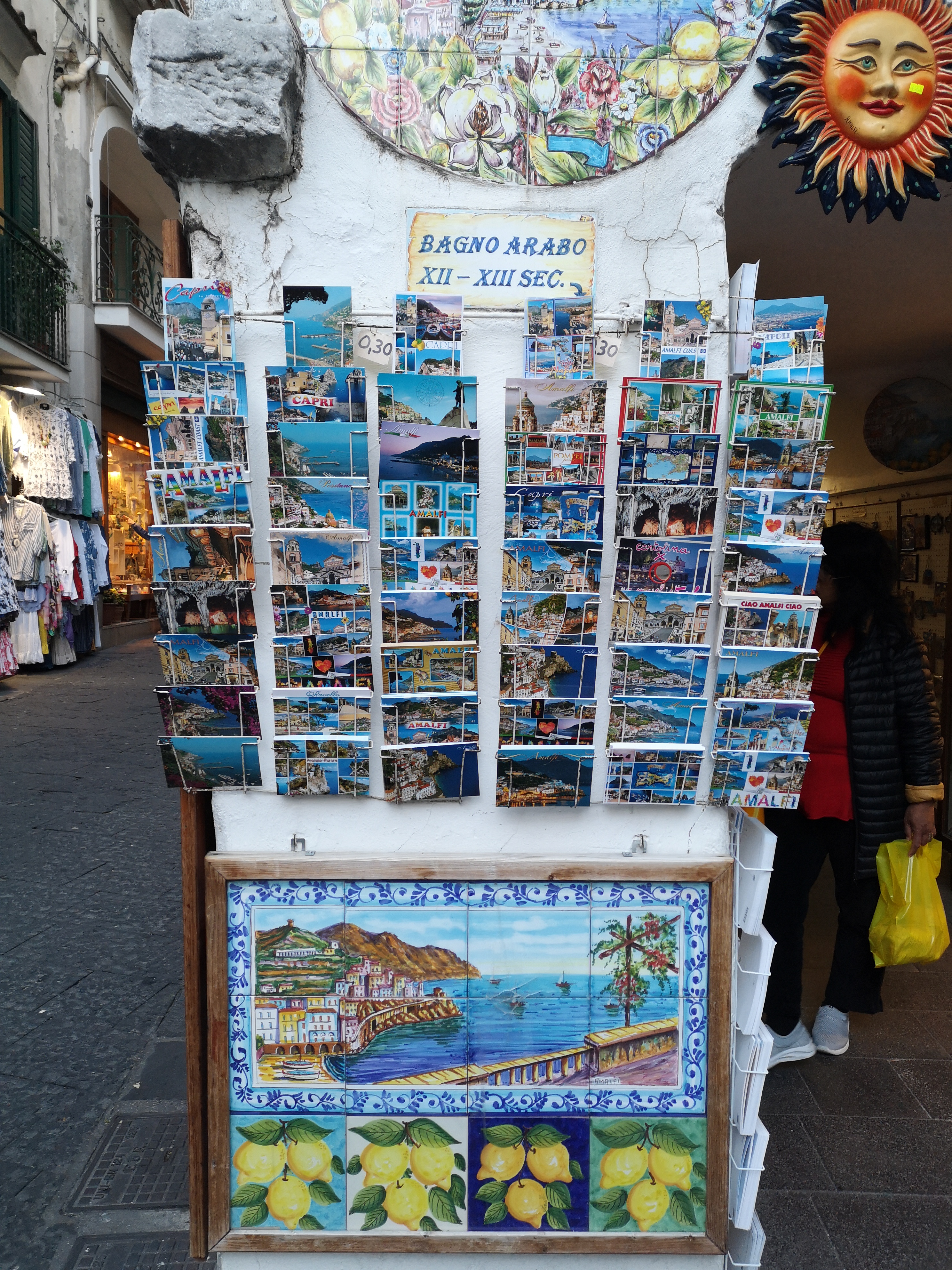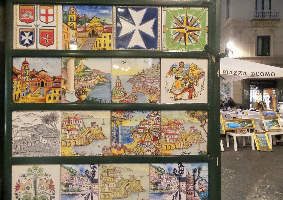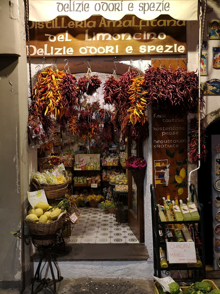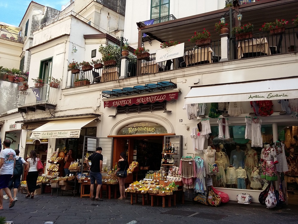 Išilgai Amalfi miestą eina pagrindinė gatvė. Daug įvairių mažų parduotuvėlių, kuriose galite nusipirkti Amalfi pakrantės suvenyrų. Dauguma jų Amalfio pakrantės citrinų gaminiai: muiliukai (plaunant rankas pakvimpa visa vonia, patikrinta), citrinų likeris it. limoncello, citrininiai saldainiai, kremai. Gausu keramikos dirbinių, su įspūdingais piešiniais, beje galite užsisakyti ir jums nusiųs į bet kurį pasaulio kampelį. Gali apsilankyti drabužių parduotuvėlėse, ten gausu kokybiško lino ir medvilnės drabužių, tinkančių prie jūros ir paplūdimiui. Moterims siūlau Antica Sartoria, žymus skraisčių and maudymosi kostiumų ir spalvingų suknelių gamintojas.