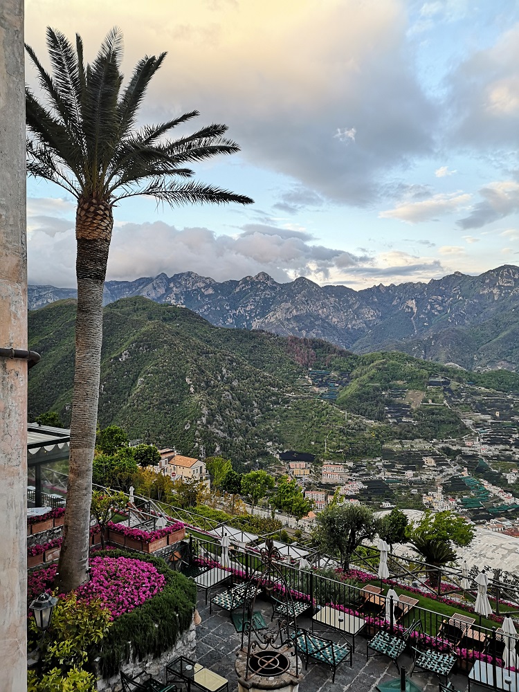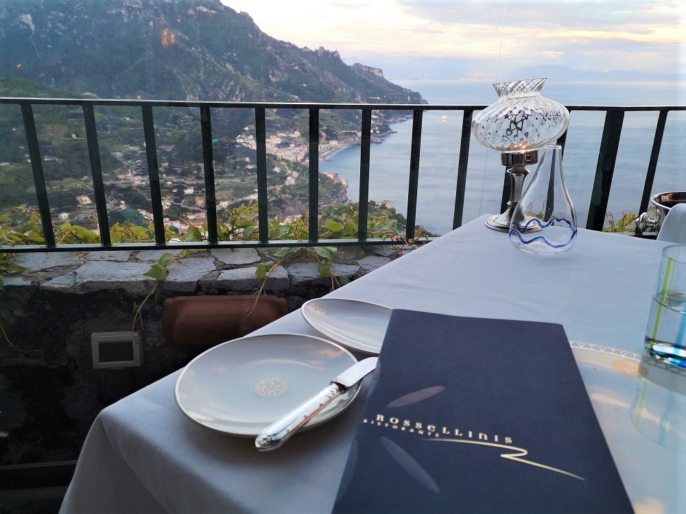 Romantiškai vakarienei siūlau likti Ravelo mieste ir pasimėgauti vakariene su vaizdu. Vienintelis turintis Michelin žvaigždę Ravelo mieste yra „Rossellinis” restoranas, įsikūrės įspūdingame 5* viešbutyje Palazzo Avino. Restoranas veikia terasoje iš kurios, kaip jau turbūt numanote, atsiveria kvapą gniaužianti panorama. Degustacinio meniu kaina 180eur žmogui. Geriausia rezervuoti staliuką iš anksto, nes restoranas populiarus turistų iš viso pasaulio tarpe.