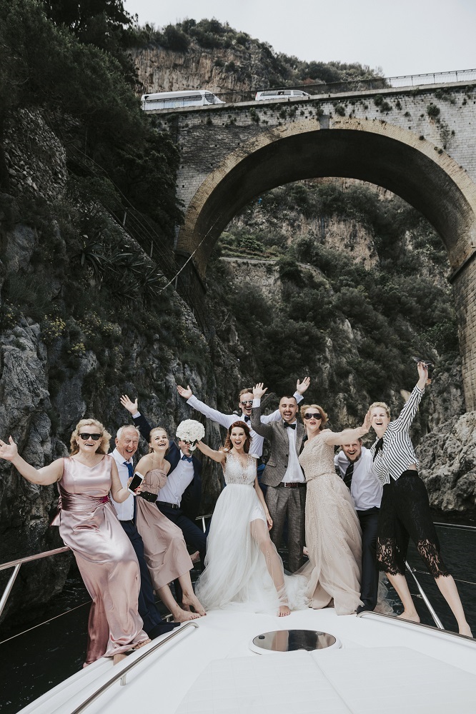 Pagaliau išaušo lauktas vestuvių rytas saulėtoje Amalfi pakrantėje. Viskas buvo tobula nuo ankstyvo makiažo ir šukuosenos su charizmatiška itale. Jos darbo rezultatai pranoko visų damų lūkesčius, iki vėlyvo vakaro, kuris baigėsi itališkomis dainomis. Be galo šilta ceremonija Amalfi katedroje su lietuviu kunigu, italų šūksniai ir turistų sveikinimai išėjus iš bažnyčios. Užkandžiai ir gėrimai su nuostabiu vaizdu į jūrą. Pasiplaukiojimas jachta link Positano, vėjui pučiant, skambant muzikai ir su šokiais!! Vėliau fotosesija Villa Ruffolo soduose su nuostabiais vaizdais, o vakarienė Ravello miesto įspūdingame Belmond Caruso restorane aukštai kalnuose. Pabaigai fejerverkai ir šokiai skambant fortepijono melodijoms.