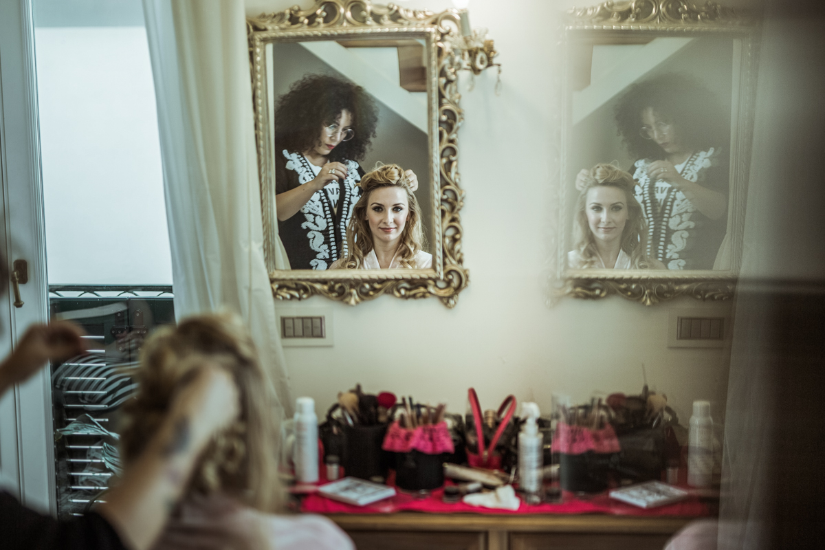 Pasakysiu, kad nuotakoms vestuvių rytą pradėjus grožio ritualus dingsta visas nerimas ir stresas, o jaunikiai pamatę savo mylimąją, jos dar labiau geidžia. Dėl makiažo ir šukuosenos susitariama iš anksto pagal nuotakos norimą įvaizdį, derinamą su vestuvine suknele. Vestuvių dieną paliekama pakankamai laiko patikrinti kelis skirtingus variantus. Siekiama makiažu išryškinti jūsų natūralų grožį, o ne pakeisti veido bruožus. Apskritai, italai yra perfekcionistai ir dirba tol, kol nuotaka lieka patenkinta esamu rezultatu. Nepamirškite, jog Italijos grožio ir mados industrija yra viena pirmaujančių pasaulyje. Beje, jei anksčiau jaunikiai spyriojosi del grimo, tai dabar nei vienas neatsisako keliems grožio štrichams.
