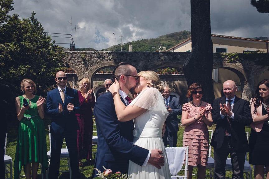 Diena prasidėjo su neramumais 🙂 Kirpėjas vėlavo 20min, todėl buvau strese, bet kirpėjas ramiai spėjo laiku papuošti visas damas. Dovilė užtikrino, kad yra laiko. Šiose situacijose palinkėčiau, pasitikėti planuotoja, kuri derina laikus ir nepergyventi. Italijoje, laikas bėga kitaip, todėl pasiduokit itališkui tempui, nes viskas bus gerai. Ceremonija vyko sklandžiai, svečiai gyrė muzikantus. Po ceremonijos ėjome į Villa Fraulo terasą itališkam aperityvui su stulbinančiu vaizdu į visą Amalfio pakrantę, gėrėtis šiltu ir saulėtu oru balandį buvo malonumas svečiams. Fotosesija patiko, nes nebuvo ilga, o svarbiausia rezultatas geras. Vėliau išplaukėm su kateriu pasigrožėti Amalfio pakrante. Kapitonas papasakojo miestelio istorijų ir legendų, skambant itališkai muzikai TI AMOOOOOOOOOOOO… Buvo nuostabu, visi svečiai, o taip pat ir mes atsipalaidavome. Po pasiplaukiojimo visi patraukėme į vilą, kurioje buvome apsistoję ir kurioje vyko šventinė vakarienė ir šokiai. Viskas buvo tikrai nepakartojama: papuošimai, ir žvakių šviesa, bei išaukštai matomi naktinio miesto ir jūros vaizdai, itališka muzika fone, aptarnavimas ir tas nuostabiai skanus itališkas maistas. Tai buvo mažos ir sočios ir negirtos lietuviškai-itališkos vestuvės. Visi patenkinti ir laimingi džiaugėsi švente, tol kol nereikėjo išvykti namo ir grįžti į realybę.