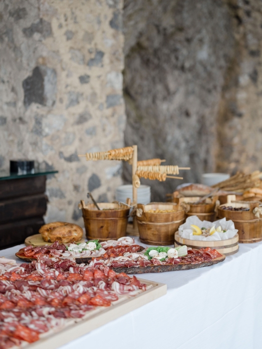 Italijoje vestuvių vakarienei galite prašyti visko ir rinktis iš didelės patiekalų įvairovės. Meniu bus sudarytas iš užkandžių it. aperitivo, serviruojamas kaip bufetas ir valgoma stovint ar prisėdant besišnekučiuojantis su svečiais, grojant muzikai. Tai viena laukiamiausių dalių, kai galite skanauti įvairiausius itališkus skanėstus: prosciutto, breasaola, saliami, parmiggiano, pecorino, burrata, mozzarella, picos, aliejuje keptos daržovės. Po 1-2val. būsite pakviesti prie stalo ir čia padavėjų bus serviruojama vienas arba du pirmi it. primi piatti ir vienas antrasis patiekalas it. il secondo. Į meniu bus įtrauktas vestuvinis tortas, mineralinis vanduo, vynas. Toks maisto kiekis tiesiog įprastas ir yra nustatyta italų tvarka, sakymai, kad daug nevalgote, kainos, deja, nepakeis. Patikėkite, čia ir aukštos klasės restoranuose valgoma daug ir niekada neišeisite iš restorano alkani.